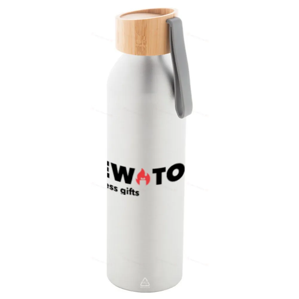 Бутылка из переработленного алюминия с крышкой из бамбука и силиконовым ремешком подходящего цвета, 600 мл.