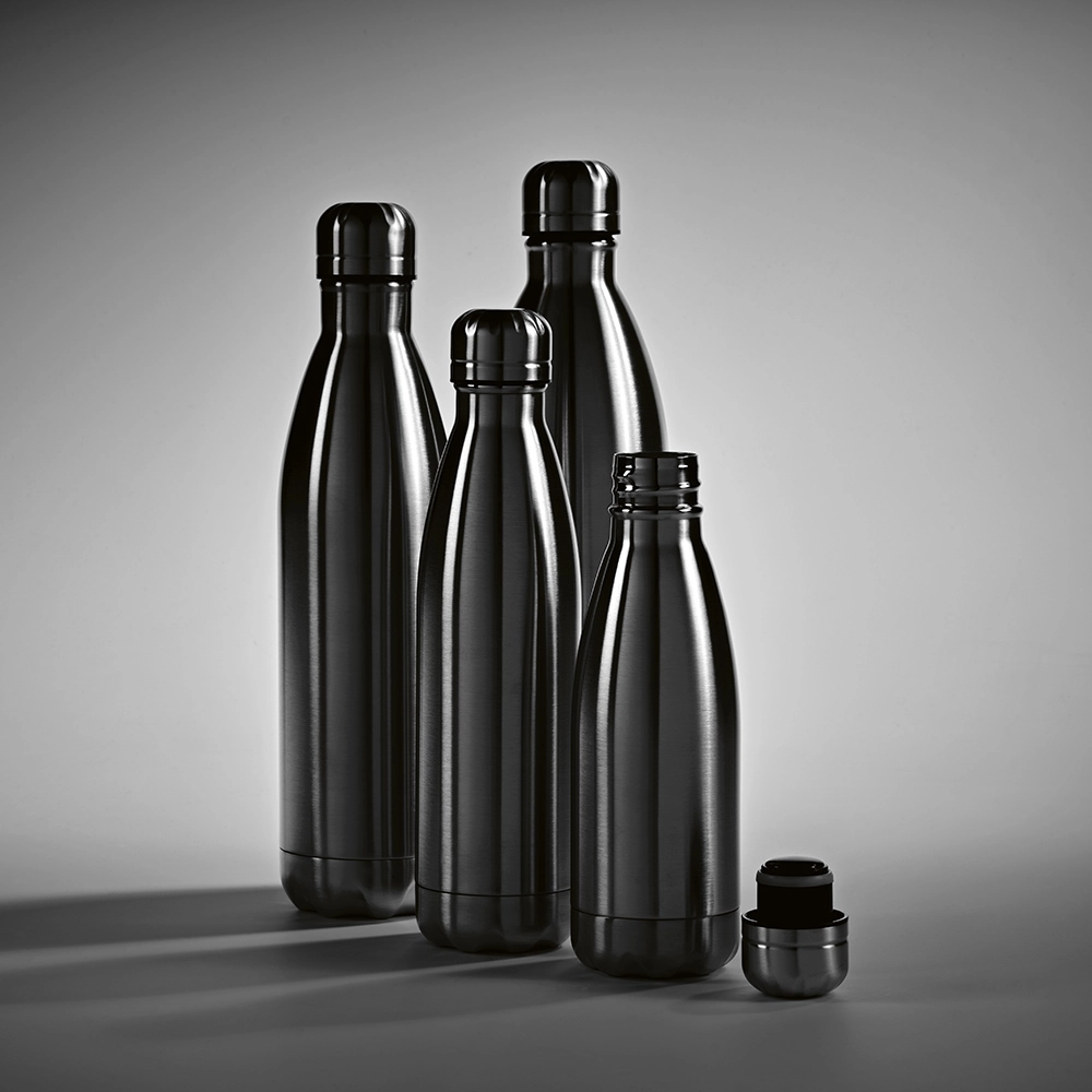 Бутылка из переработанной нержавеющей стали объемом 1100 мл (чистый объем 1070 мл) - это блестящий акцент. Она экологична и подходит для мытья в посудомоечной машине. Герметичный дизайн избавляет от беспокойства о протекании, а двойные стенки гарантируют оптимальную температуру напитков.