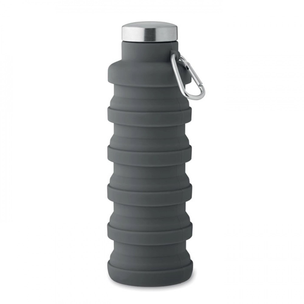 Collapsible silicone bottle with stainless steel lid and aluminium carabiner. The carabiner is not for climbing (non-professional use). Capacity: 500 ml.