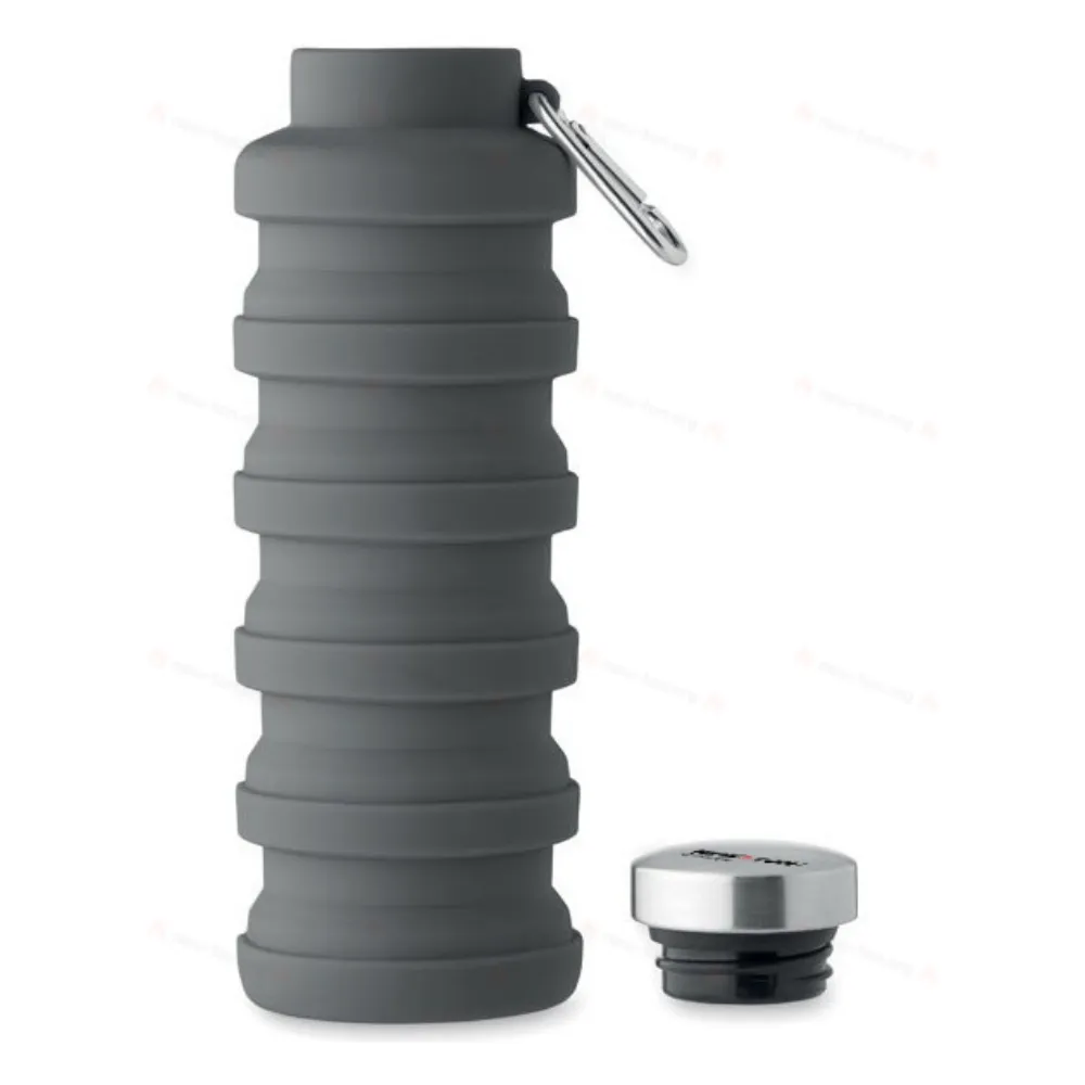 Складная силиконовая бутылка с крышкой из нержавеющей стали и алюминиевым карабином. Карабин не предназначен для альпинизма (непрофессиональное использование). Объем: 500 мл.