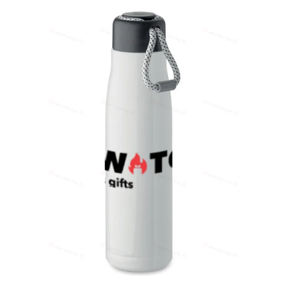 Термос с двойными стенками из 90% переработанной нержавеющей стали и 10% нержавеющей стали со шнурком-держателем на крышке из полипропилена. Герметичен. Объем: 500 мл.