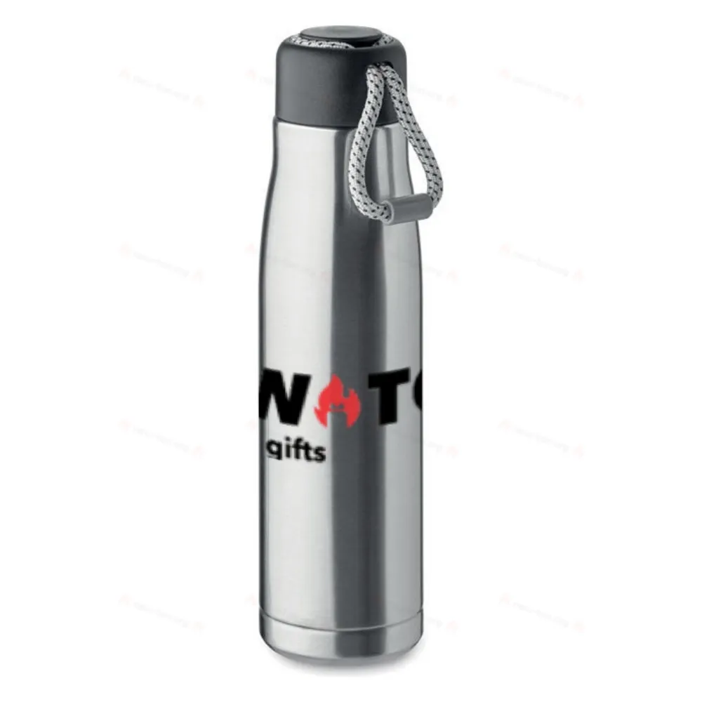 Термос с двойными стенками из 90% переработанной нержавеющей стали и 10% нержавеющей стали со шнурком-держателем на крышке из полипропилена. Герметичен. Объем: 500 мл.