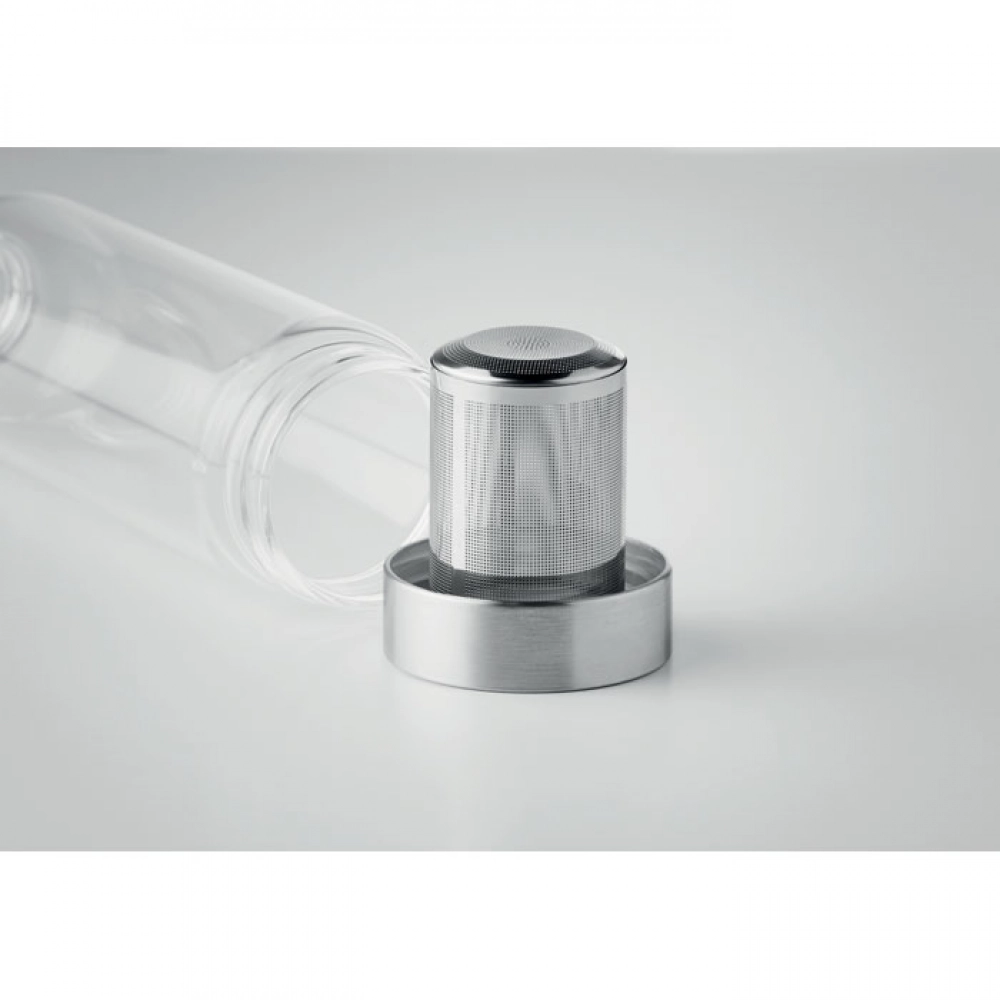 Фляга питьевая из боросиликатного стекла с чайным ситечком в неопреновом чехле. Емкость 500 мл. Не протекает.