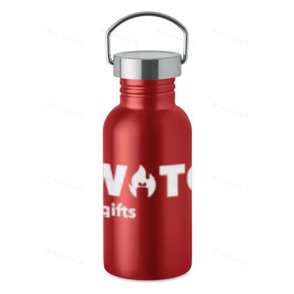 Одностенная бутылка из переработанной нержавеющей стали 90% и 10% нержавеющей стали. Крышка с ручкой для переноски. Герметична. Объем: 500 мл.