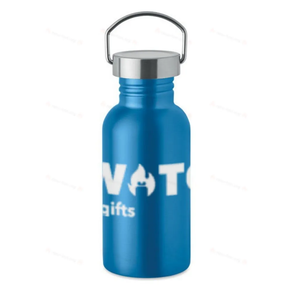 Одностенная бутылка из переработанной нержавеющей стали 90% и 10% нержавеющей стали. Крышка с ручкой для переноски. Герметична. Объем: 500 мл.