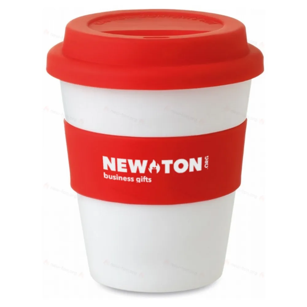 Одностенчатый стакан из блестящего белого полипропилена с силиконовой крышкой и ободком. Емкость 350мл. Поскольку это одностенчатое изделие, осторожно - может нагреваться!