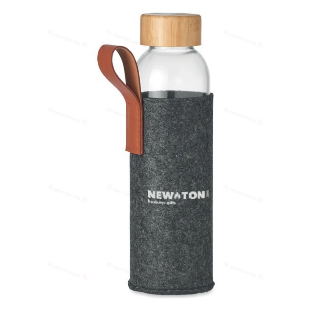 Стеклянная бутылка с бамбуковой крышкой в чехле из полиэстера RPET на полиуретановой ручке. Емкость: 500 мл.