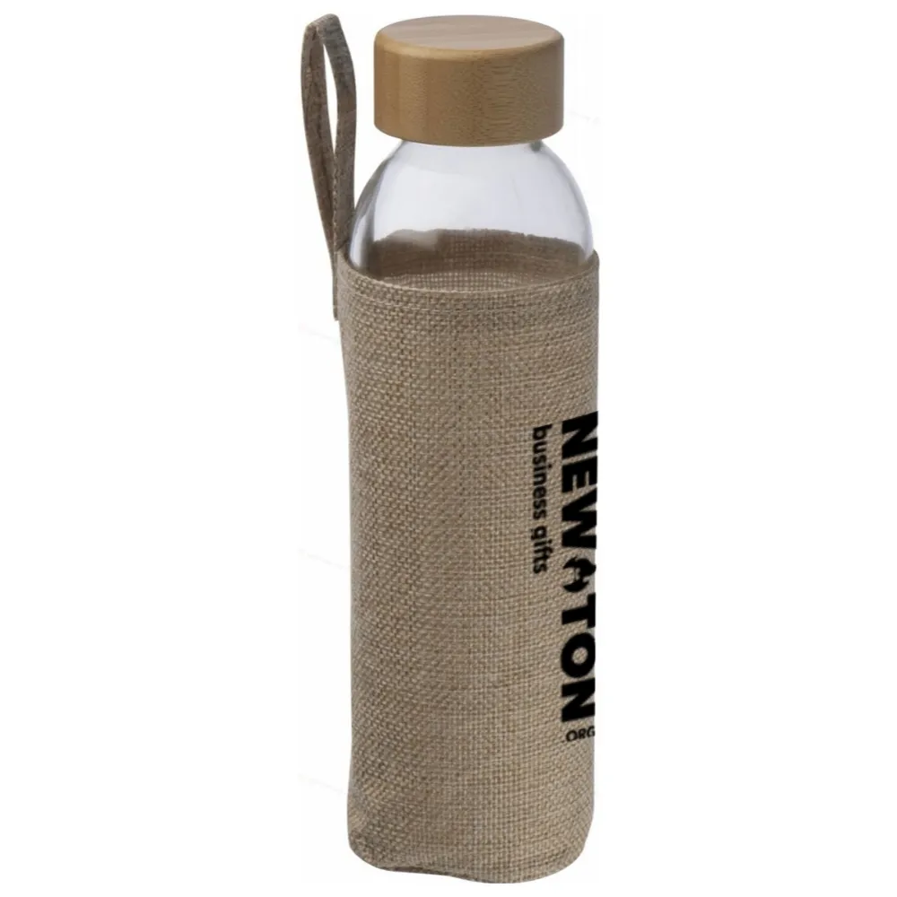 Непроливаемая стеклянная бутылка с бамбуковой крышкой, чехлом из джута, петлей и объемом 500 мл. Ваш логотип будет напечатан посередине джутового чехла.