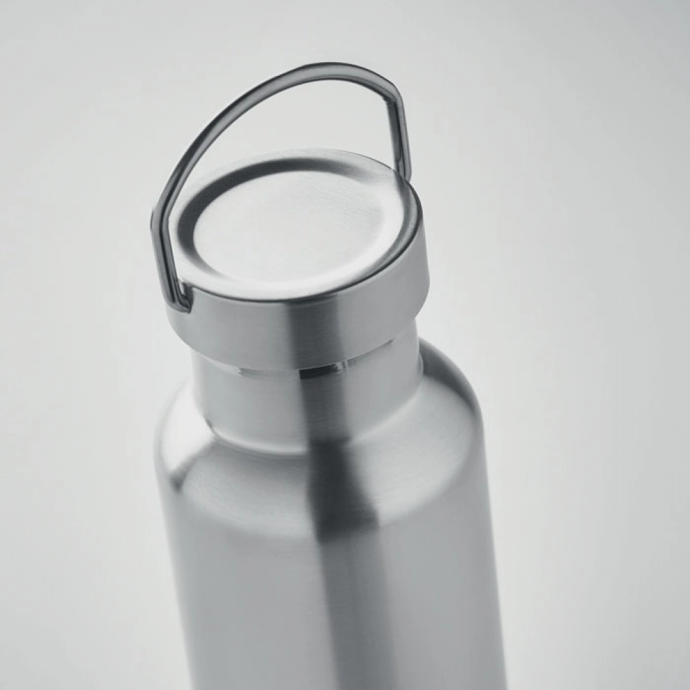 Термос с двойными стенками из переработанной нержавеющей стали 90% и 10% нержавеющей стали с крышкой и ручкой. Герметична. Объем: 500 мл.