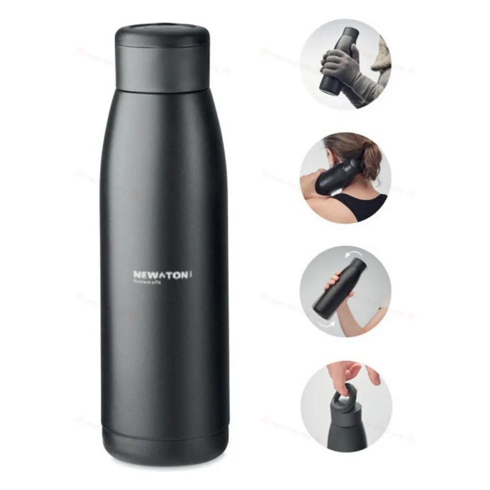 Бутылка с двойными стенками из переработанной нержавеющей стали (90%) и обычной нержавеющей стали (10%) и мягкой силиконовой крышкой с кольцом для переноски. При простом встряхивании бутылки температура меняется на нагрев или охлаждение, в зависимости от жидкости внутри. Герметична. Объем: 400 мл.