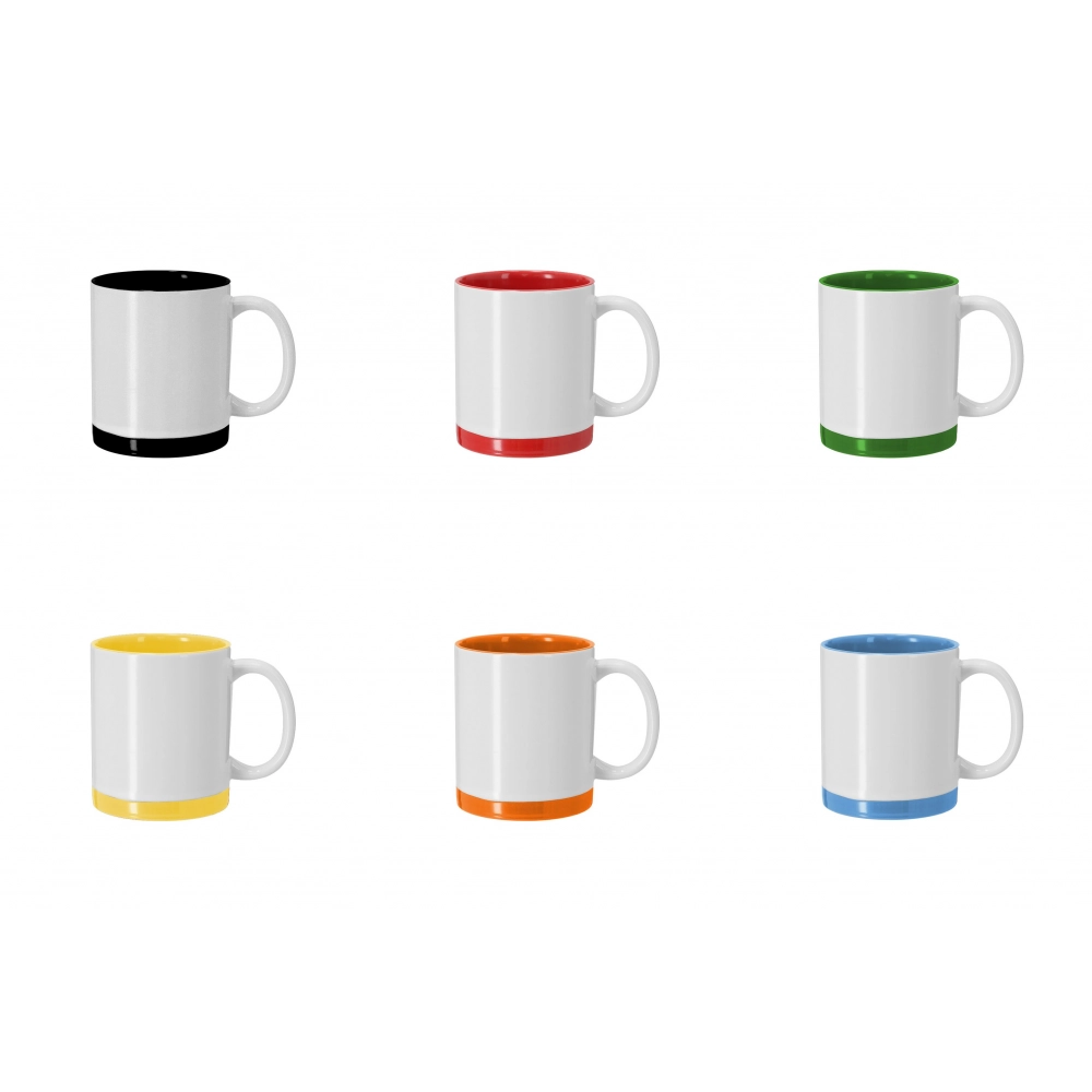 Керамическая кружка объемом 350 мл, выполненная в белом цвете снаружи и с соответствующими цветовыми деталями на основании и внутри. Специально разработана для нанесения сублимационной маркировки.