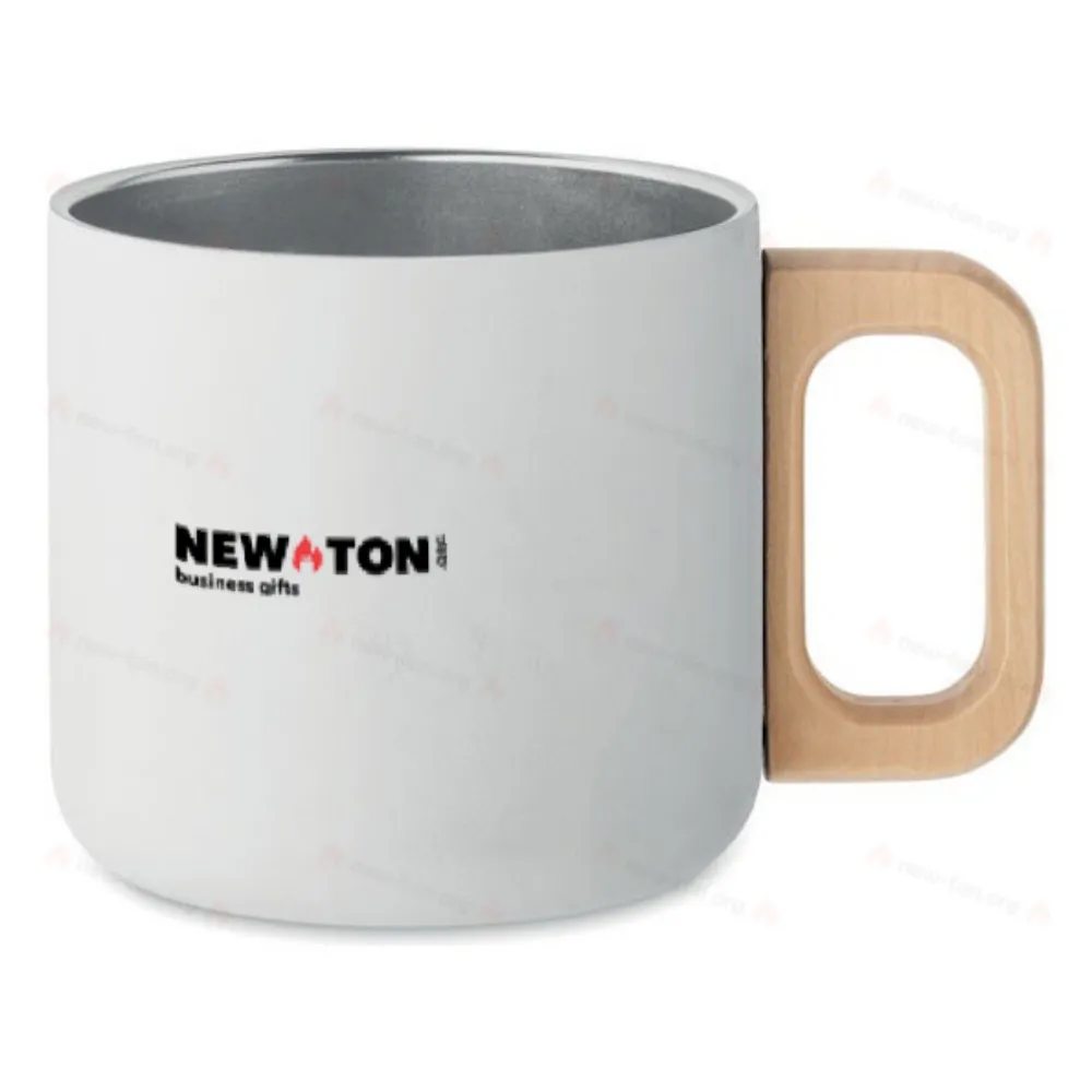 Кружка с двойными стенками из переработанной нержавеющей стали (90%) и обычной нержавеющей стали (10%) с деревянной ручкой. Объем: 350 мл.