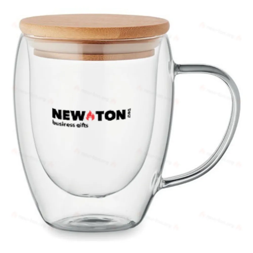 Кружка из боросиликатного стекла с двойными стенками, ручкой и бамбуковой крышкой. Объем: 300 мл.