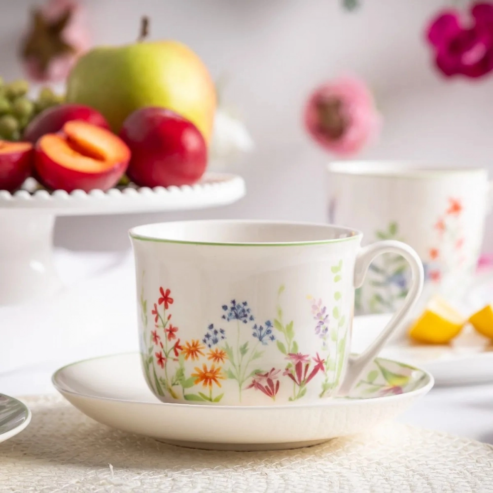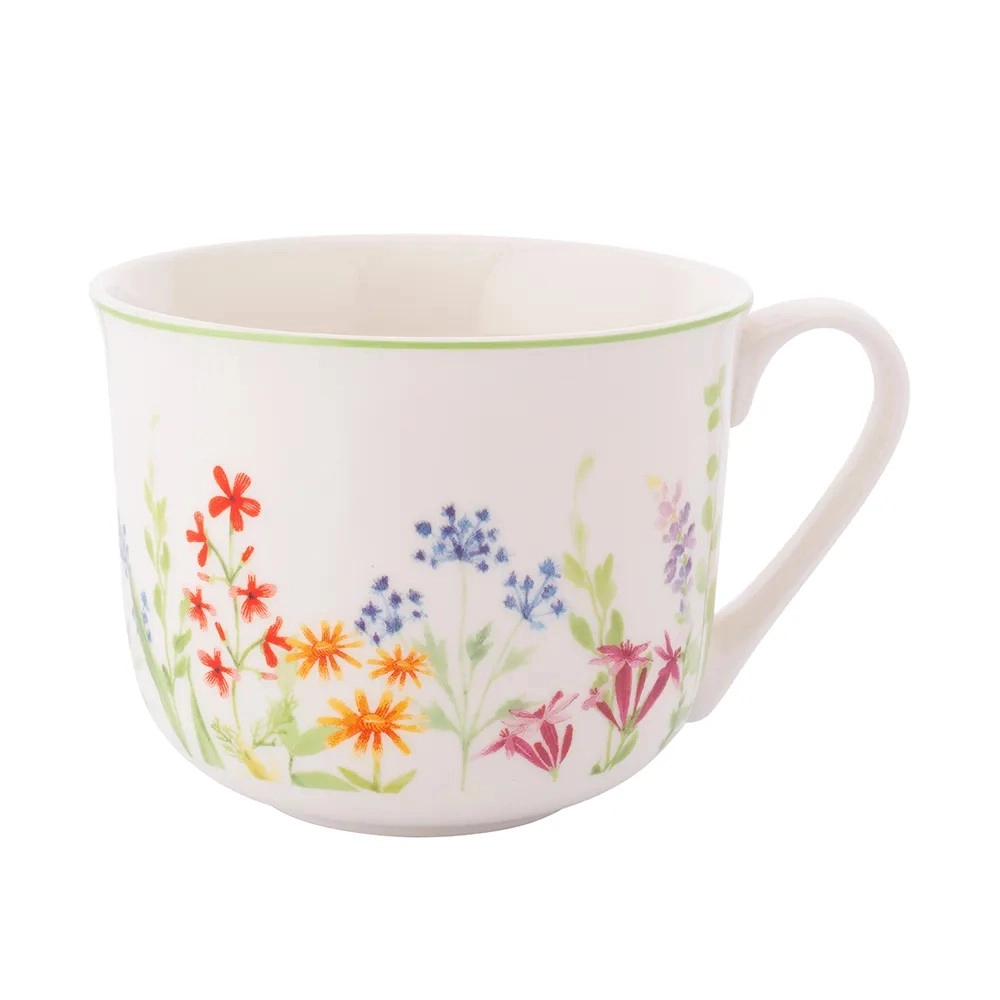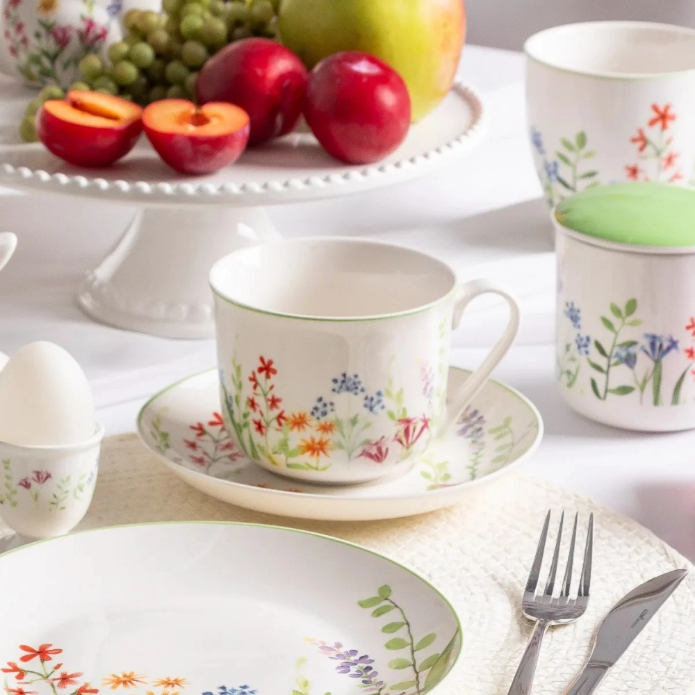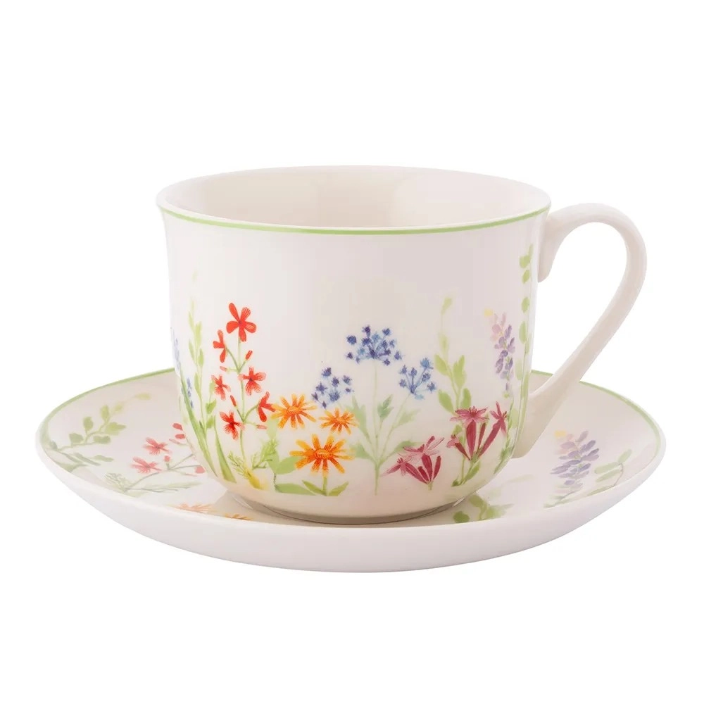 Наслаждайтесь каждым моментом отдыха с большой фарфоровой чашкой и блюдцем. Большой объем 450 мл идеально подходит для долгих утренних посиделок с ароматным чаем или любимым кофе. Нежные мотивы полевых цветов, вдохновленные пробуждением природы, добавляют романтики и утонченности, создавая приятную атмосферу с каждым глотком. Чашка изготовлена ​​из высококачественного фарфора NBC, что гарантирует ее прочность и устойчивость к ежедневному использованию. Удобная ручка позволяет чашке комфортно лежать в руке, а элегантное блюдце дополняет ее стильный внешний вид, защищая поверхность стола от возможных проливаний. Большая чашка — отличный выбор как для повседневных моментов отдыха, так и для элегантных застолий. Ее вневременное очарование и функциональность делают ее идеальным подарком для ценителей исключительного фарфора. Добавьте ее в свою коллекцию и наслаждайтесь любимыми напитками в изысканном стиле!