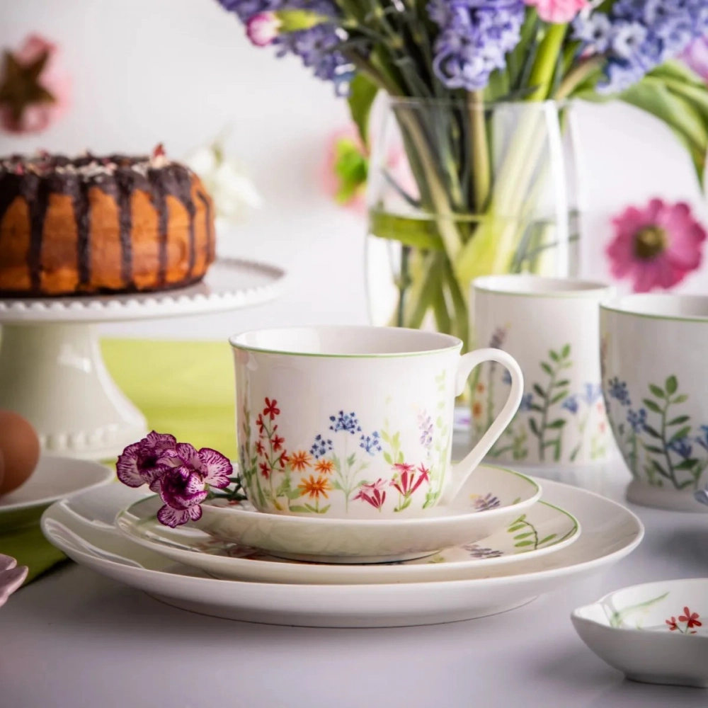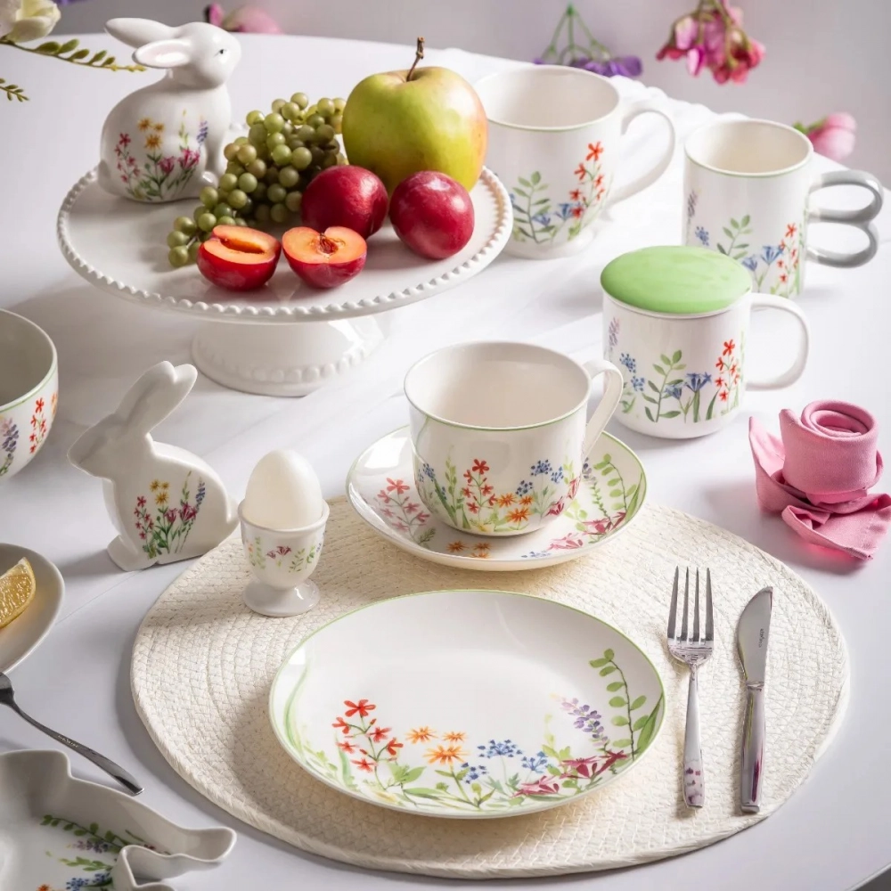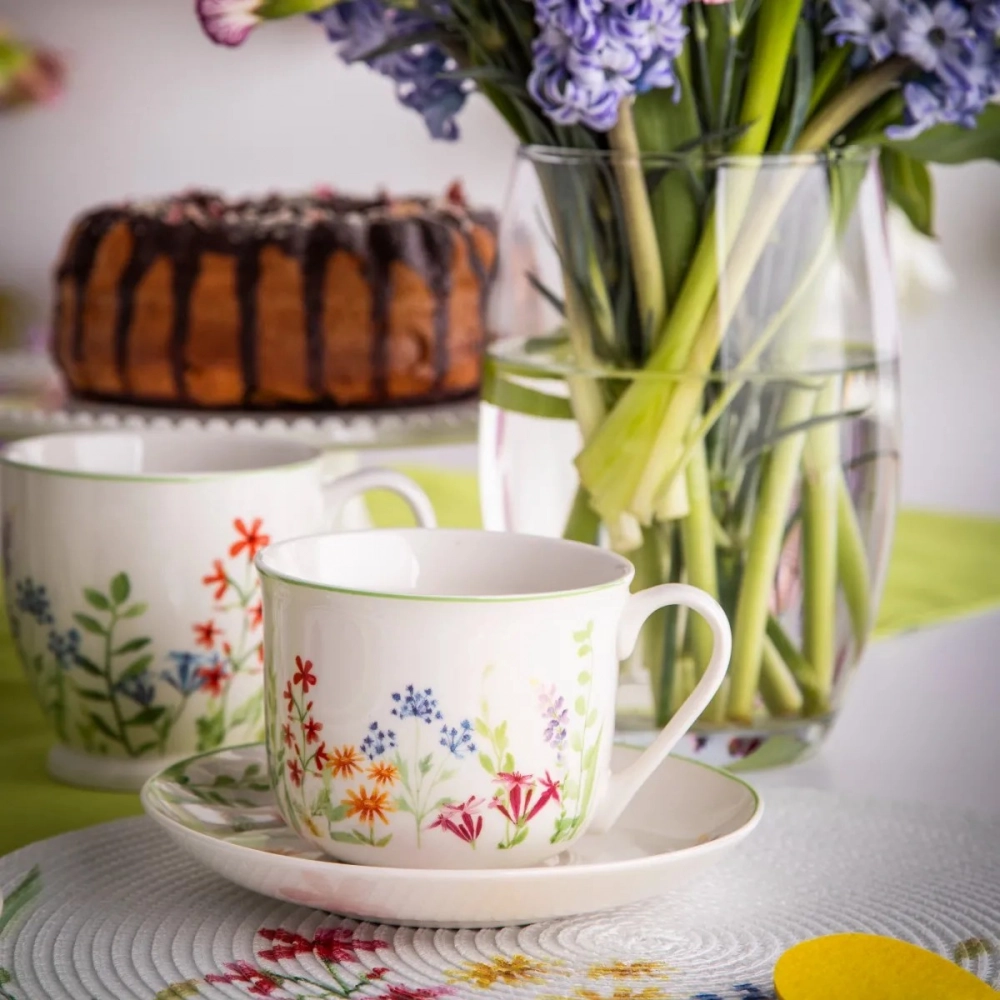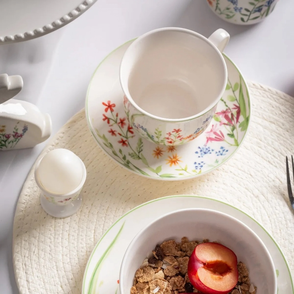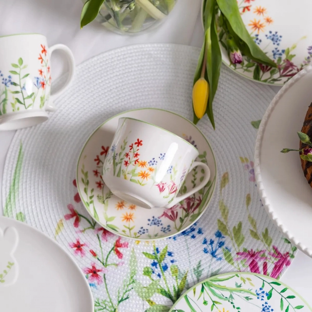Наслаждайтесь каждым моментом отдыха с большой фарфоровой чашкой и блюдцем. Большой объем 450 мл идеально подходит для долгих утренних посиделок с ароматным чаем или любимым кофе. Нежные мотивы полевых цветов, вдохновленные пробуждением природы, добавляют романтики и утонченности, создавая приятную атмосферу с каждым глотком. Чашка изготовлена ​​из высококачественного фарфора NBC, что гарантирует ее прочность и устойчивость к ежедневному использованию. Удобная ручка позволяет чашке комфортно лежать в руке, а элегантное блюдце дополняет ее стильный внешний вид, защищая поверхность стола от возможных проливаний. Большая чашка — отличный выбор как для повседневных моментов отдыха, так и для элегантных застолий. Ее вневременное очарование и функциональность делают ее идеальным подарком для ценителей исключительного фарфора. Добавьте ее в свою коллекцию и наслаждайтесь любимыми напитками в изысканном стиле!
