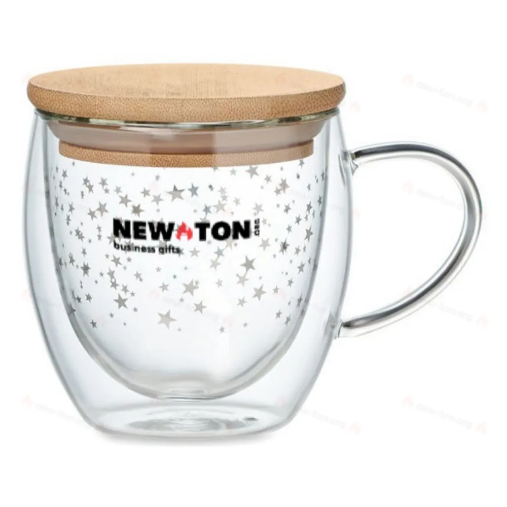 Кружка с двойными стенками из боросиликатного стекла с бамбуковой крышкой (рисунок звездочка). Объем: 220 мл.