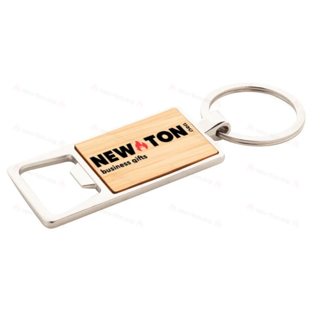 Металлический брелок с вставкой из бамбука и открывалкой для бутылок.