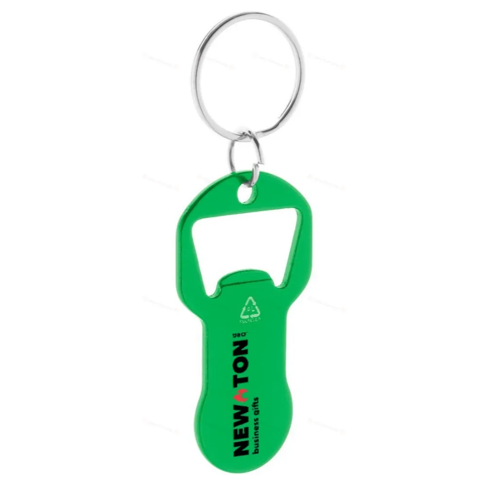 Брелок для ключей с открывалкой для бутылок из переработанного алюминия и монеткой для тележки.