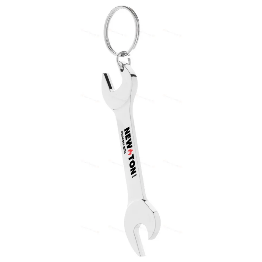 Открывалка для бутылок в форме гаечного ключа из металла на кольце. В коробке из крафт-бумаги.