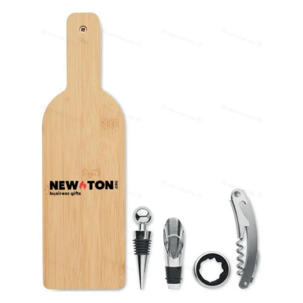 Набор для вина в форме бутылки в бамбуковом футляре. В набор входят штопор, аэратор для вина, пробка и кольцо для бутылки.