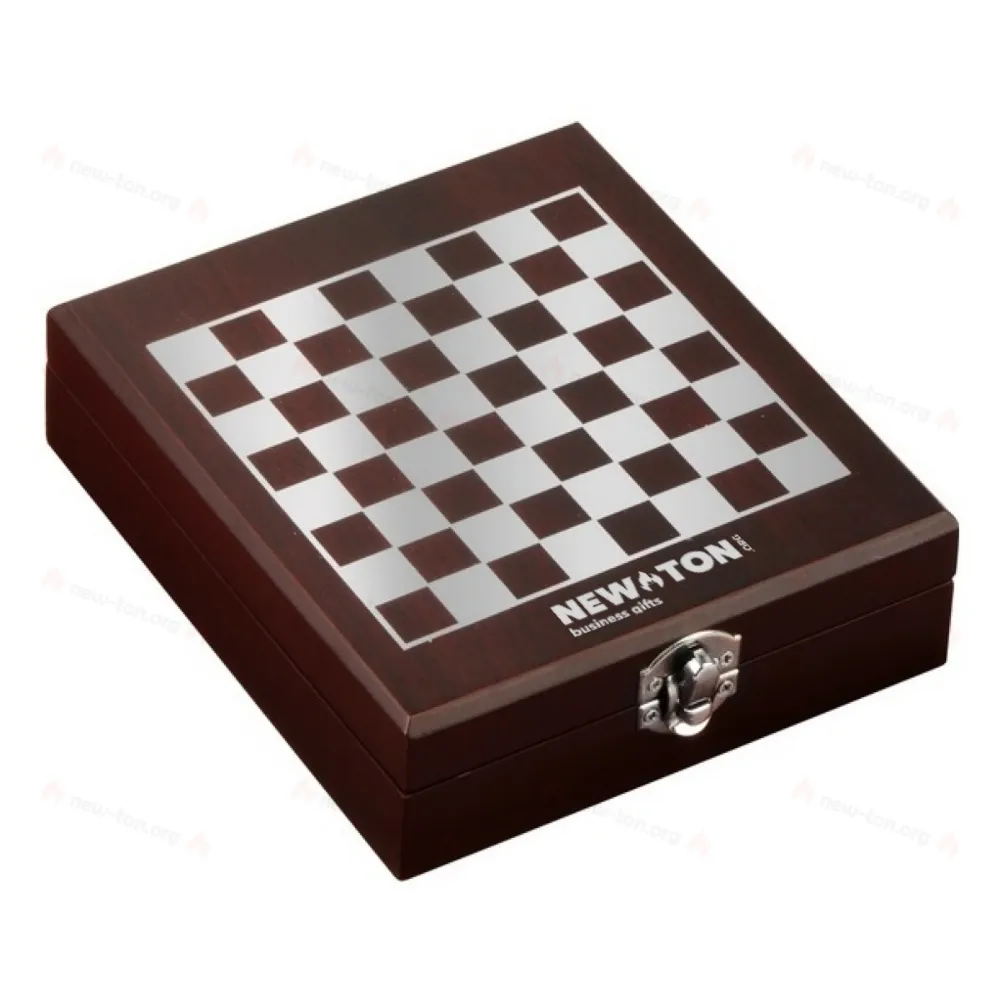 Удовольствие и хороший вкус! Набор шахматных и винных принадлежностей. Шахматные фигуры сделаны из пластика. В комплекте ручка официантского ножа, капельница, пробка и термометр. Возможна полноцветная печать (УФ).