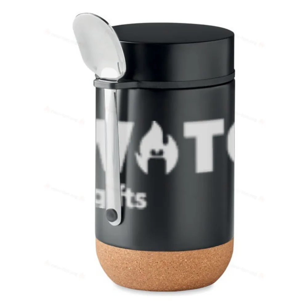 Металлический термос для продуктов с двойными стенками из нержавеющей стали с винтовой крышкой и пробковым дном. В комплект входит ложка. Объем: 400 мл.