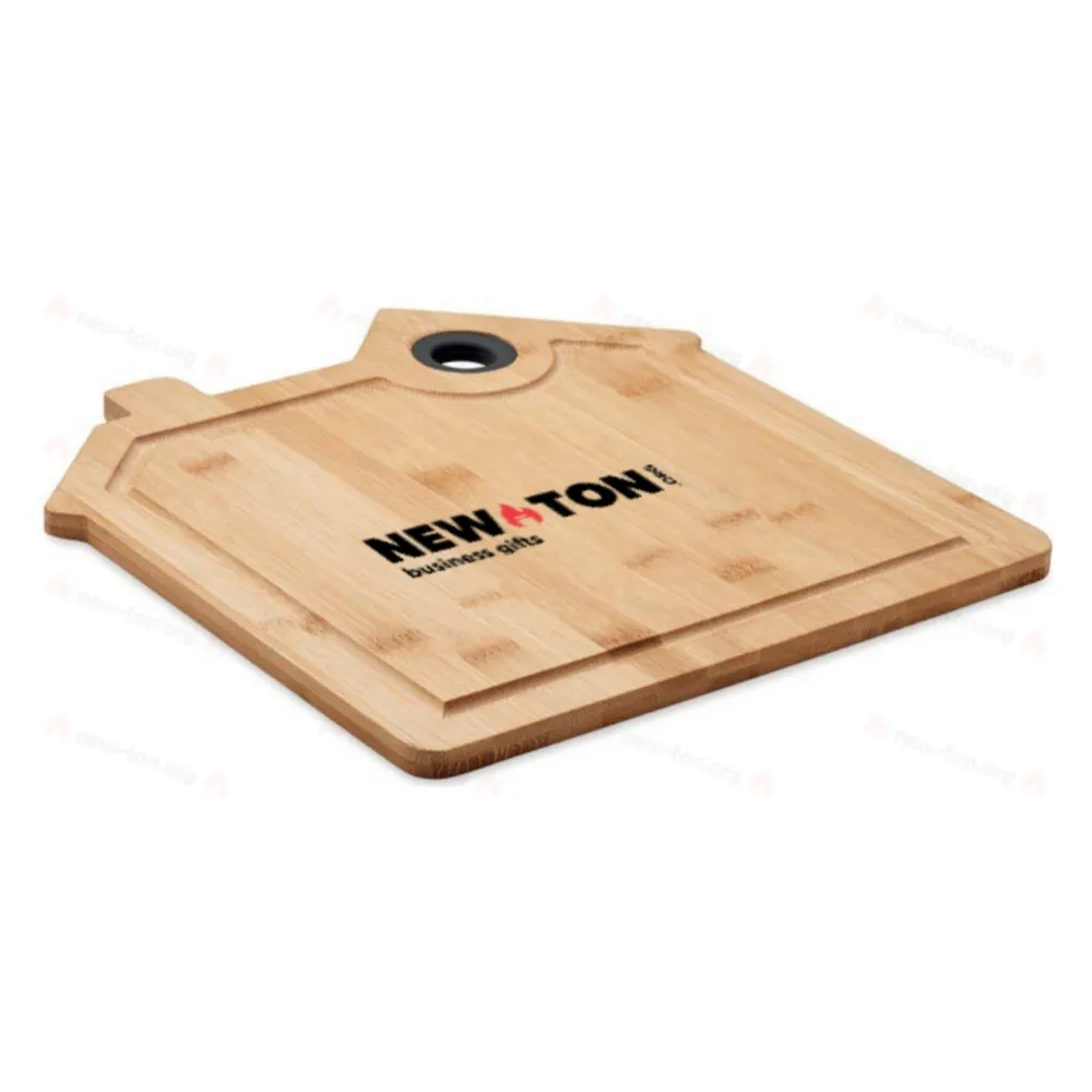 Разделочная доска в форме домика из бамбука с желобком и отверстием для подвешивания.