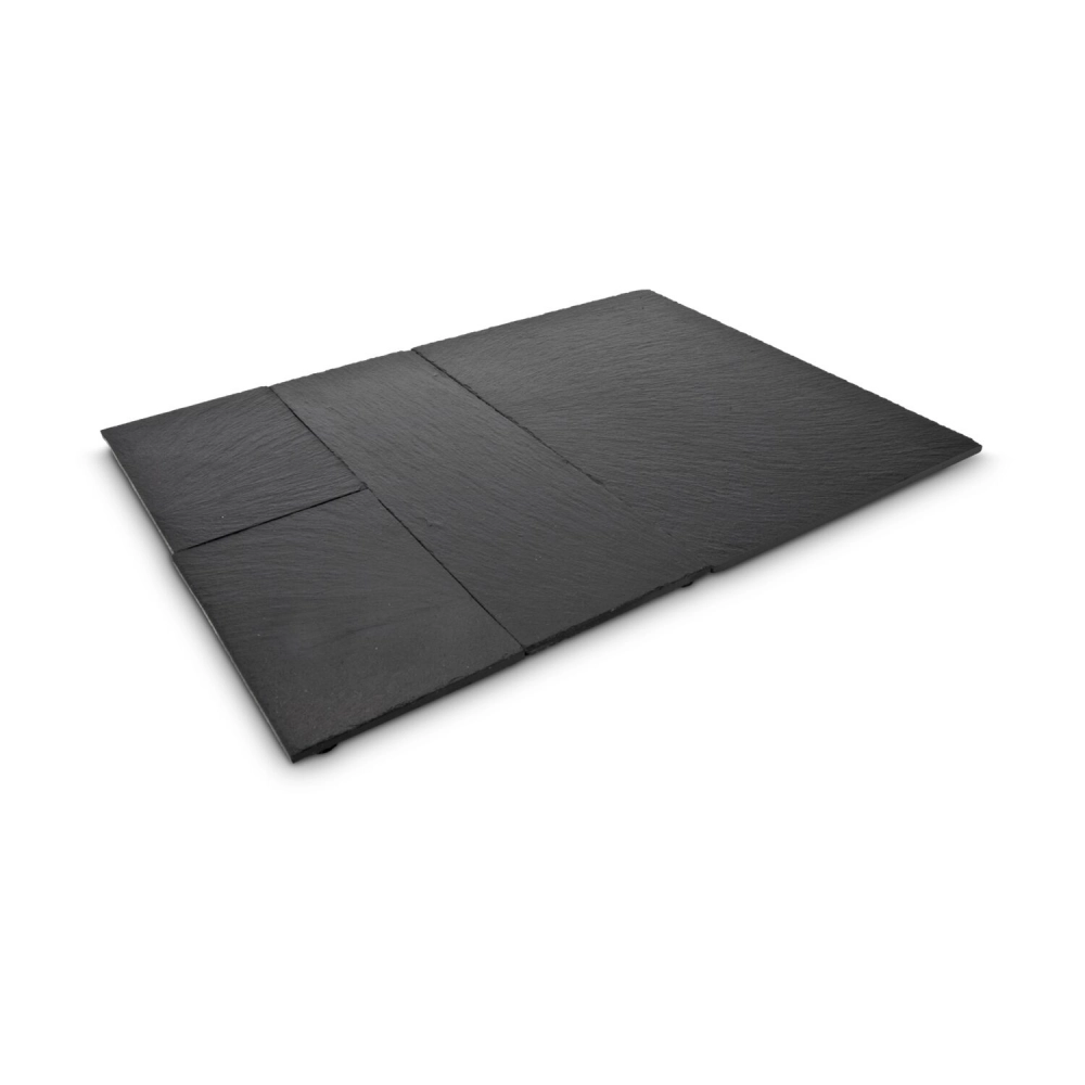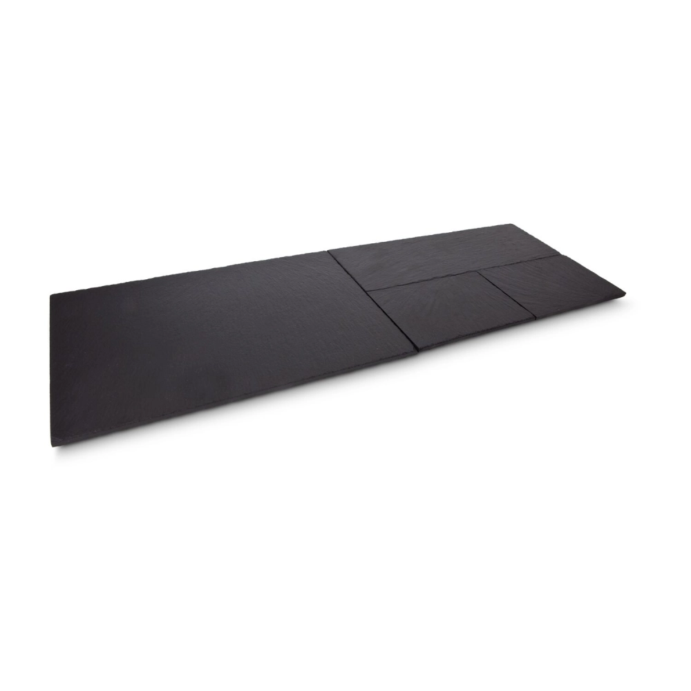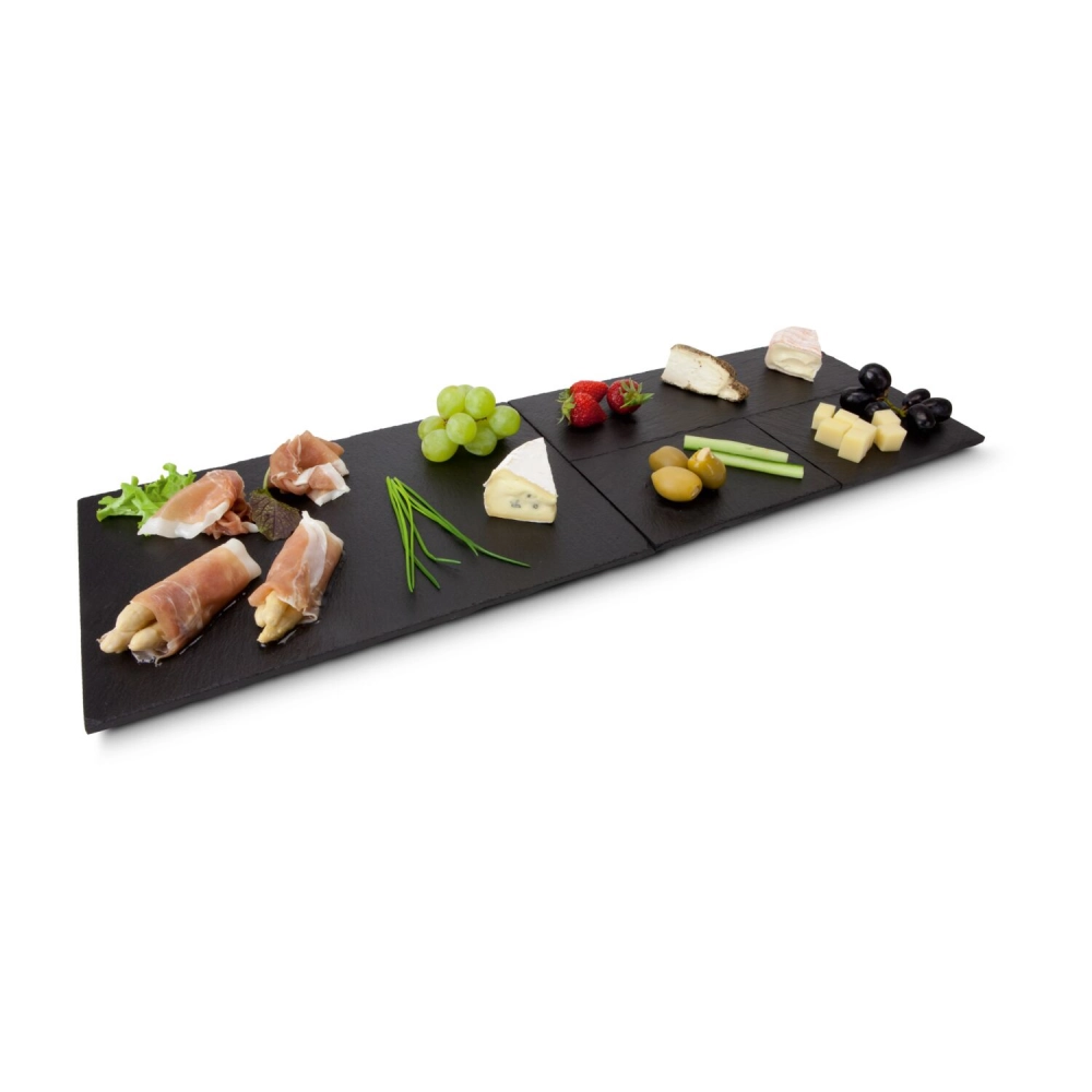 Набор сервировочных тарелок из натурального сланца из четырех частей для декоративной сервировки блюд, современные обрезанные края, не чувствительная поверхность благодаря специальной глазури, защитные планки на дне, 1 тарелка L (примерно 20 x 30 см), 1 тарелка X M (примерно 10 x 30 см) и 2 тарелки S (примерно 10 x 15 см), которые можно комбинировать творчески и по-разному.