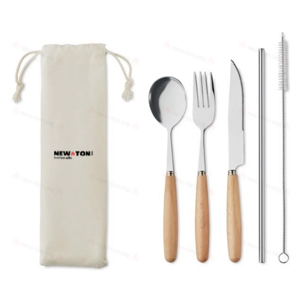 Набор столовых приборов многоразового использования из нержавеющей стали с деревянной отделкой в холщовом мешочке. Включает нож, вилку, ложку, соломинку из нержавеющей стали и щеточку для чистки.