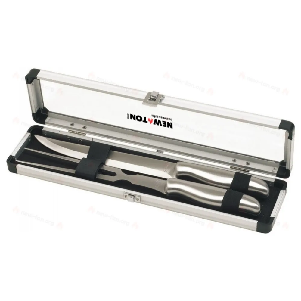 Набор столовых приборов из нержавеющей стали ROASTBEEF, состоит из ножа и вилки, упакованных в серебряный футляр с прозрачной крышкой.
