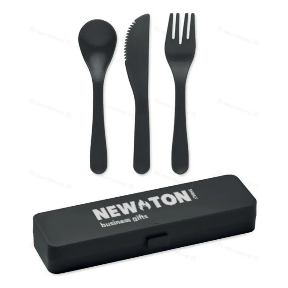 Многоразовый пластиковый набор столовых приборов в футляре. Включает ложку, вилку и нож.