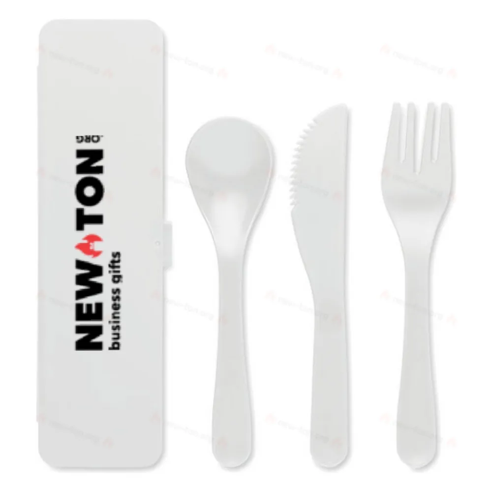 Многоразовый пластиковый набор столовых приборов в футляре. Включает ложку, вилку и нож.