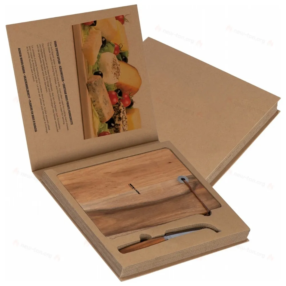 Деревянная доска для сыра с кожаным кулоном и нож из нержавеющей стали. Все упаковано в картонную подарочную коробку. Логотип можно разместить на доске или ноже.