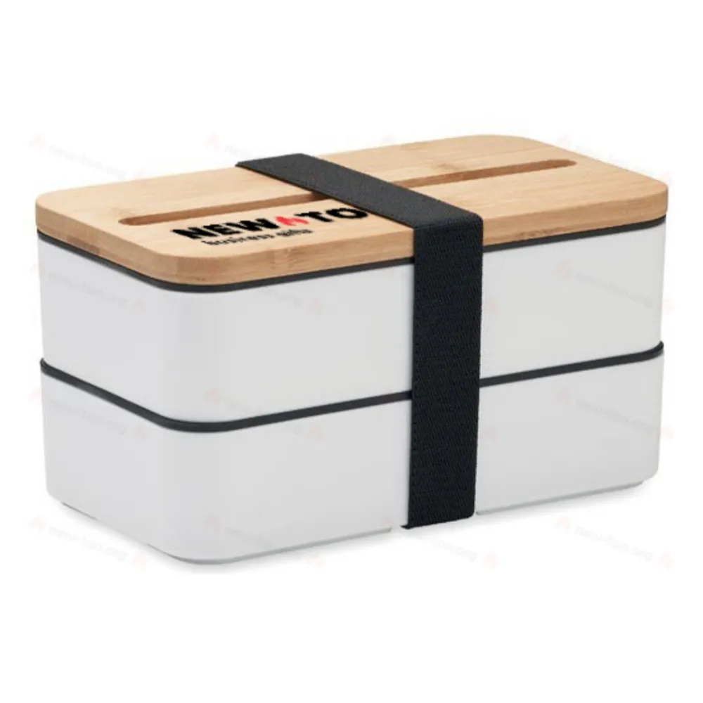 Двухуровневая ланч-бокс из полипропилена с съемным разделителем и тремя столовыми приборами, с крепящейся полиэстеровой лентой и крышкой из бамбука. Крышка также может использоваться как подставка для телефона. Объем: 400 мл (2x). Бамбук является натуральным материалом, поэтому возможны небольшие вариации в цвете и размере каждого изделия, что может повлиять на конечный результат декорирования.