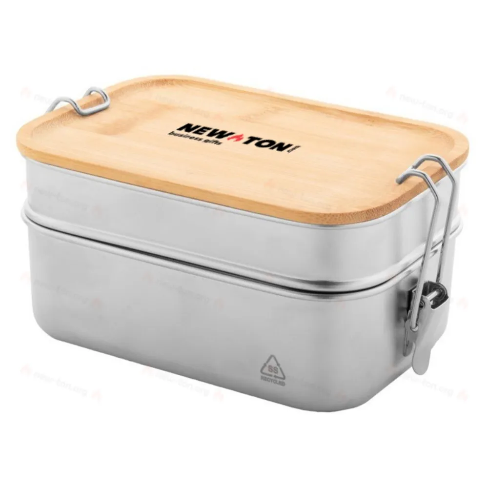 Переработанная нержавеющая стальная ланч-бокс с бамбуковой крышкой и надежным застежкой на пряжке. С двумя отделениями объемом 340 и 600 мл.