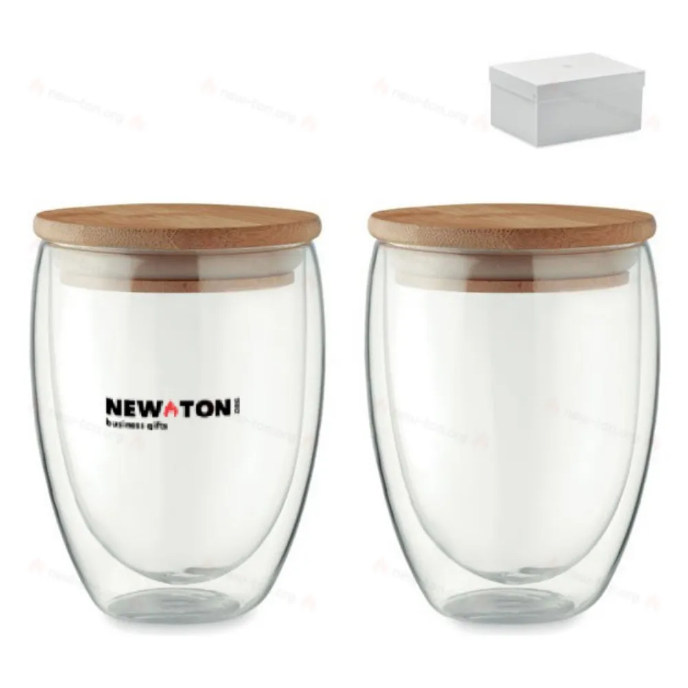 Набор стаканов из двустенного высокопрочного боросиликатного стекла с бамбуковой крышкой и силиконовым кольцом. Емкость 350 мл.