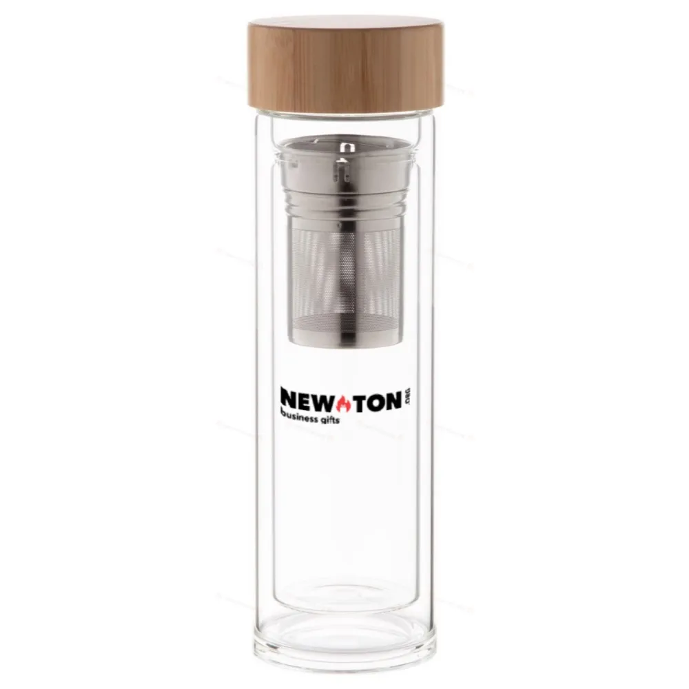 Термос из боросиликатного стекла с двойными стенками, устройством для заваривания чая и бамбуковой крышкой. 420 мл.