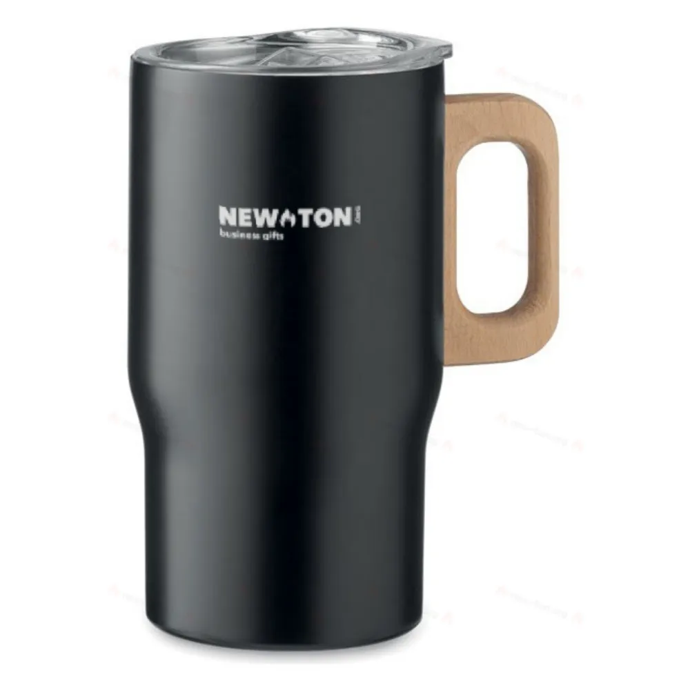 Термокружка с двойными стенками из переработанной нержавеющей стали 90% и 10% нержавеющей стали с деревянной ручкой и пластиковой крышкой. Объем: 350 мл.