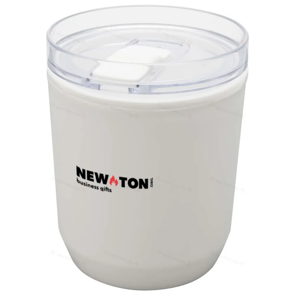 Термокружка с простым дизайном, подходящая для большинства кофемашин и автомобильных подстаканников. Имеет двойные стенки с внешней частью из переработанного полипропилена и внутренней частью из полипропилена. Сдвижная крышка изготовлена из пластика AS и полипропилена. Объем: 180 мл.