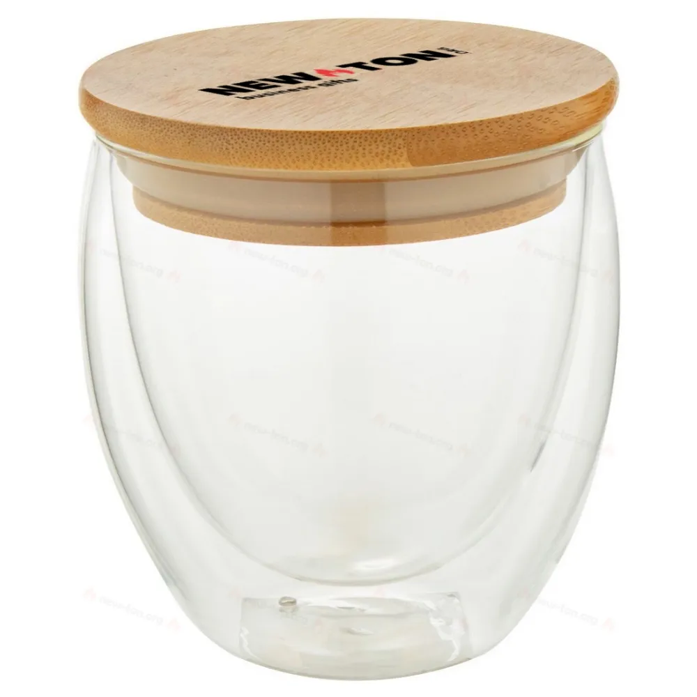 Термокружка из боросиликатного стекла с двойными стенками и бамбуковой крышкой, 250 мл. В коробке из крафт-бумаги.
