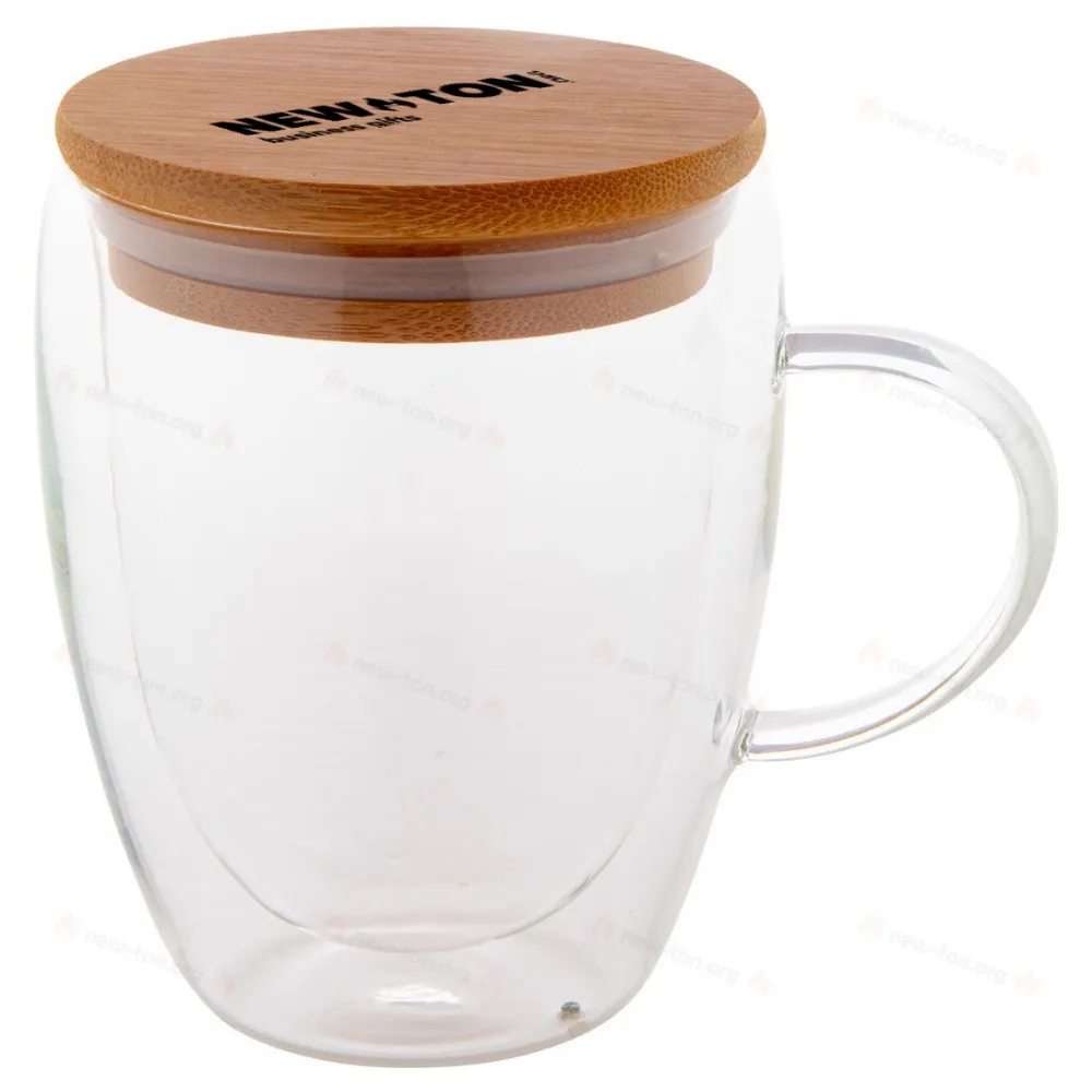 Термокружка из боросиликатного стекла с двойными стенками, с ручкой и бамбуковой крышкой, 350 мл. В коробке из крафт-бумаги.