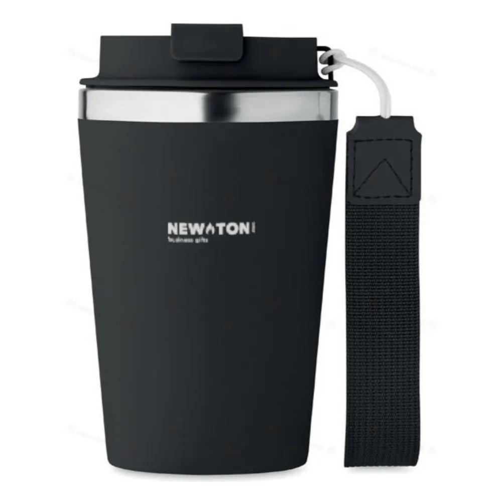 Термокружка с двойными стенками из переработанной нержавеющей стали (90%) и обычной нержавеющей стали (10%) с внешним покрытием из переработанного полипропилена с ремешком для запястья из RPET. Объем: 350 мл. Герметична.