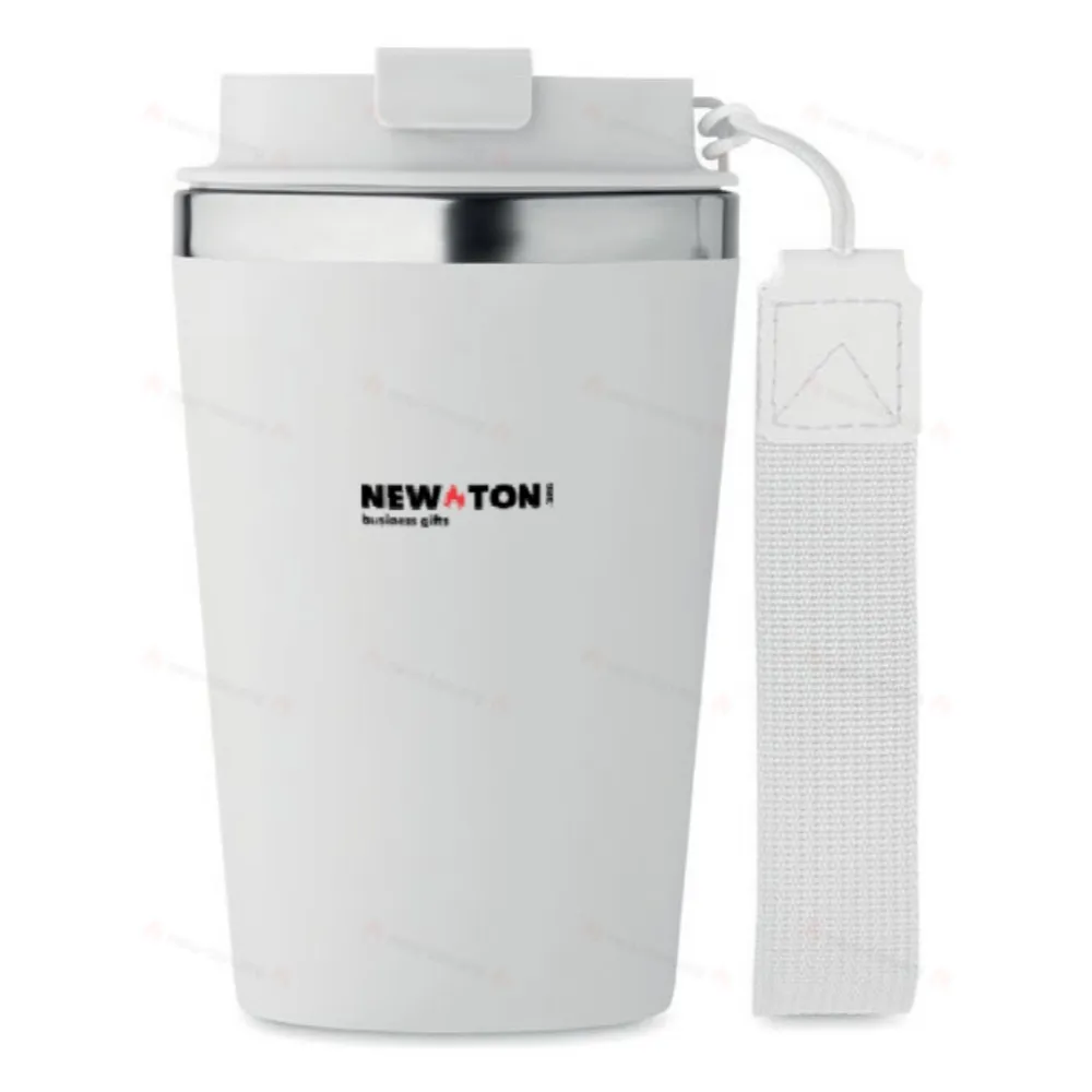 Термокружка с двойными стенками из переработанной нержавеющей стали (90%) и обычной нержавеющей стали (10%) с внешним покрытием из переработанного полипропилена с ремешком для запястья из RPET. Объем: 350 мл. Герметична.