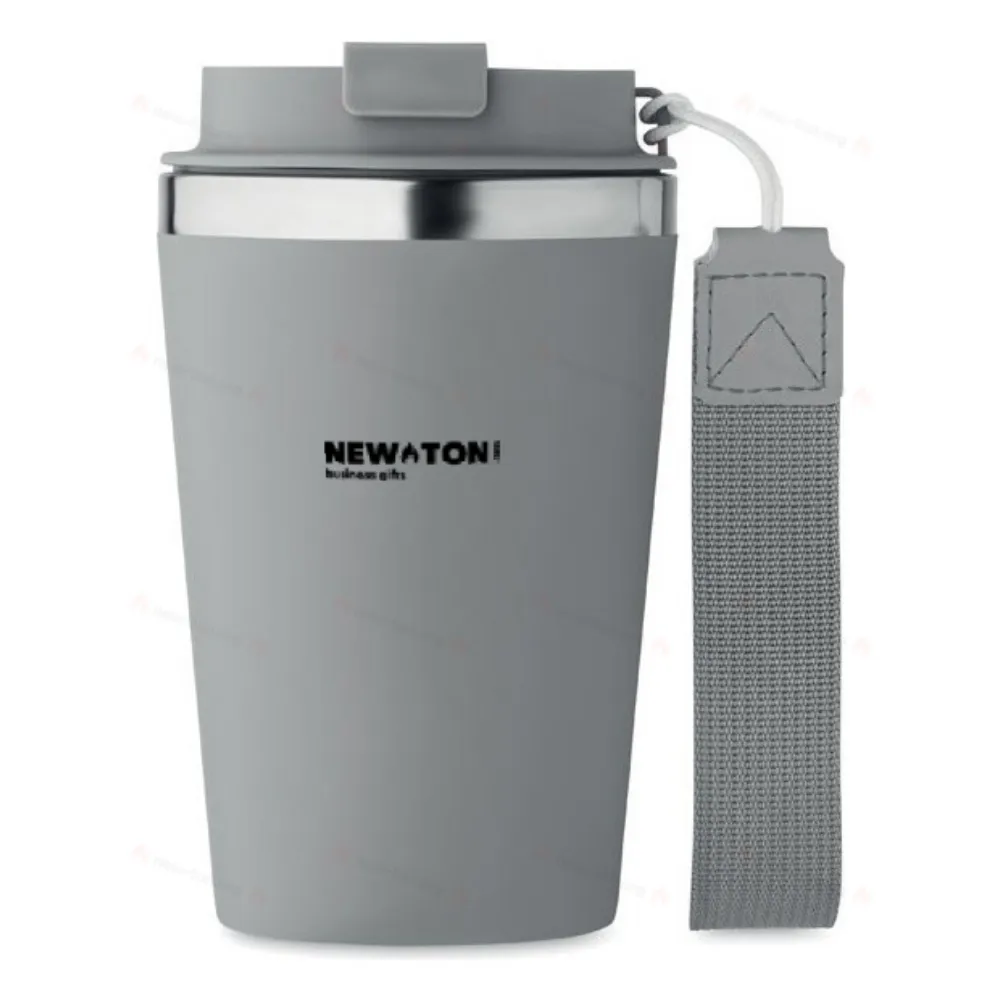 Термокружка с двойными стенками из переработанной нержавеющей стали (90%) и обычной нержавеющей стали (10%) с внешним покрытием из переработанного полипропилена с ремешком для запястья из RPET. Объем: 350 мл. Герметична.