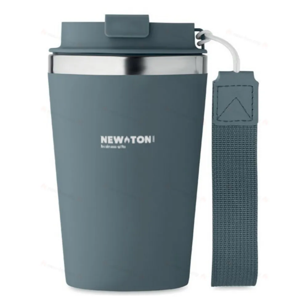 Термокружка с двойными стенками из переработанной нержавеющей стали (90%) и обычной нержавеющей стали (10%) с внешним покрытием из переработанного полипропилена с ремешком для запястья из RPET. Объем: 350 мл. Герметична.