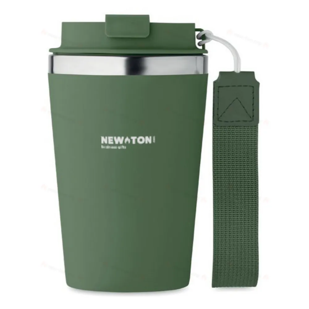 Термокружка с двойными стенками из переработанной нержавеющей стали (90%) и обычной нержавеющей стали (10%) с внешним покрытием из переработанного полипропилена с ремешком для запястья из RPET. Объем: 350 мл. Герметична.