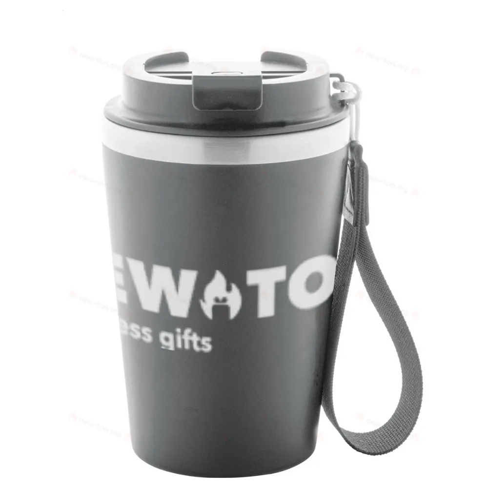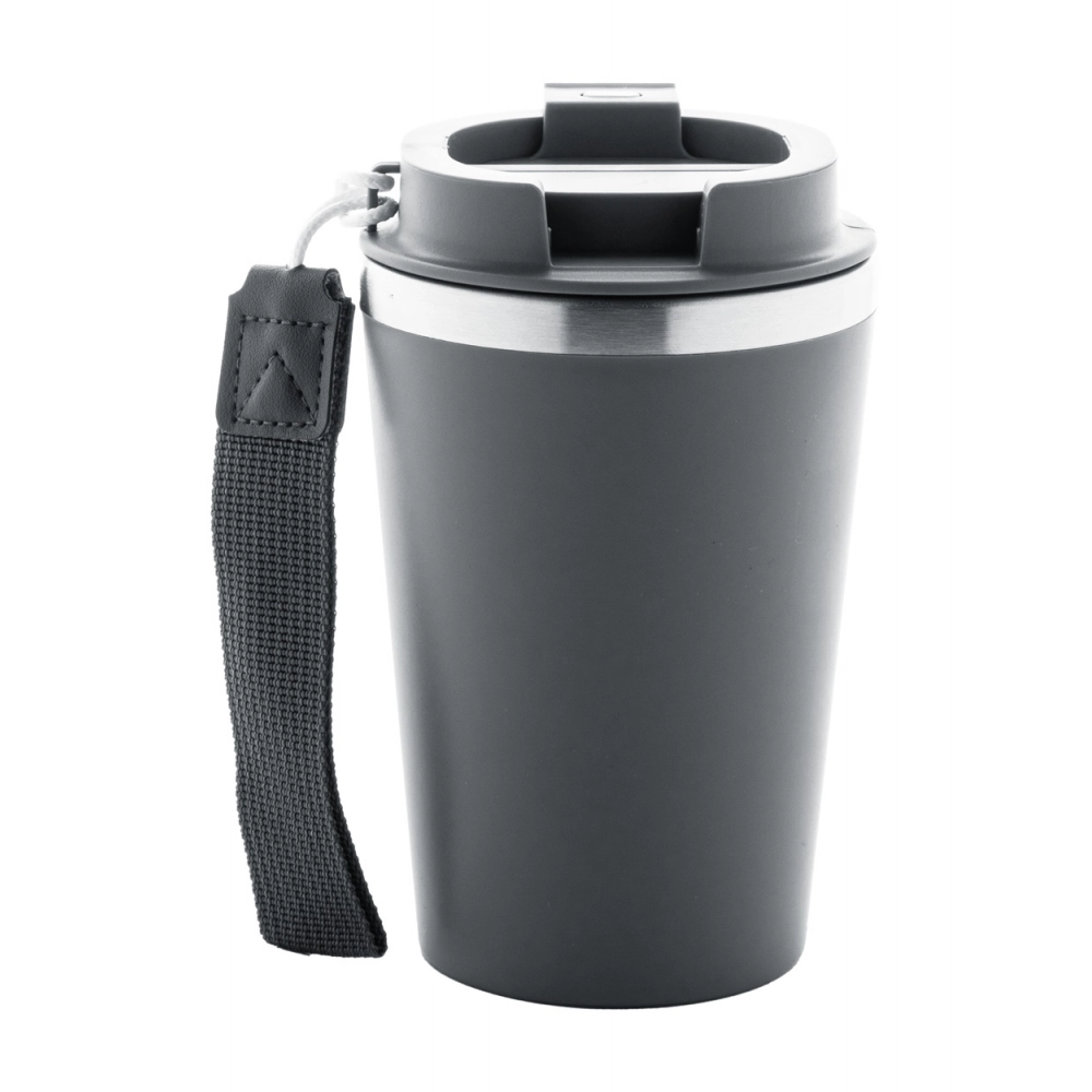 Двойная стенка, изготовленная из переработанной нержавеющей стали, изолированный термокружок с наружным слоем из пластика PP и крышкой для питья. С ремешком для переноски из RPET. 350 мл.