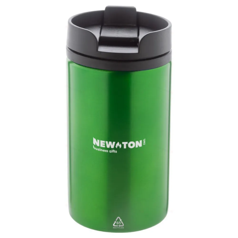 Двойная стенка, изготовленная из переработанной нержавеющей стали, изолированный термокружка с пластиковым внутренним слоем из ПП и крышкой для питья. 250 мл.