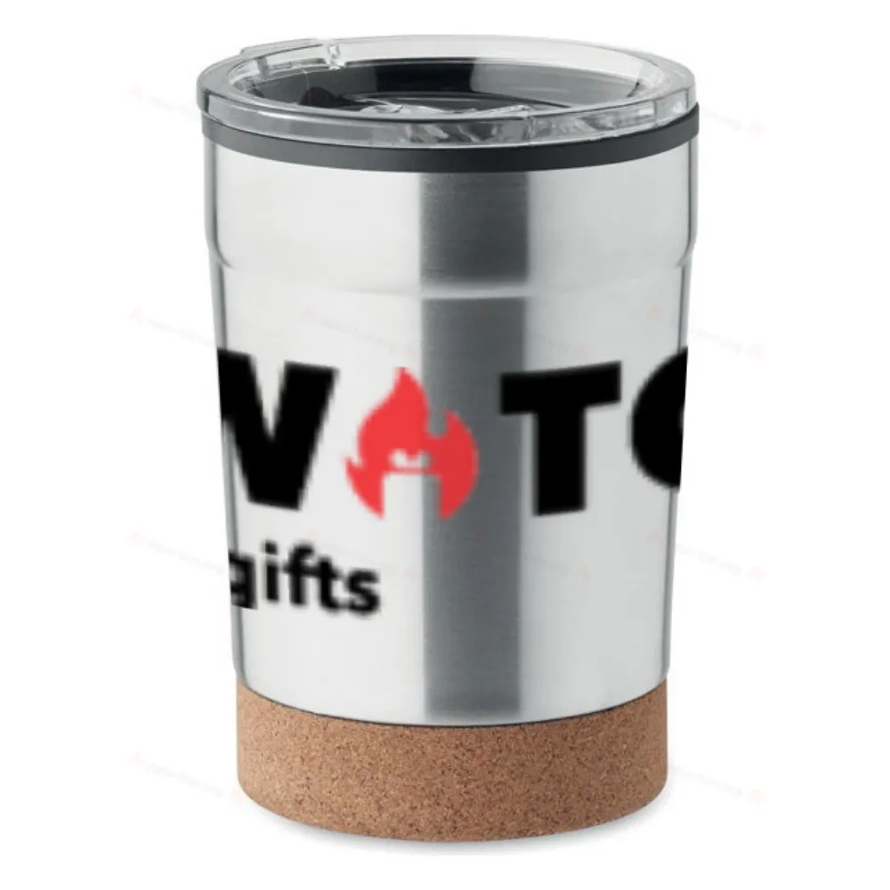 Термокружка с двойными стенками из нержавеющей стали снаружи и полипропилена внутри, пробковое дно и слайдер на крышке. Герметична. Объем: 300 мл.