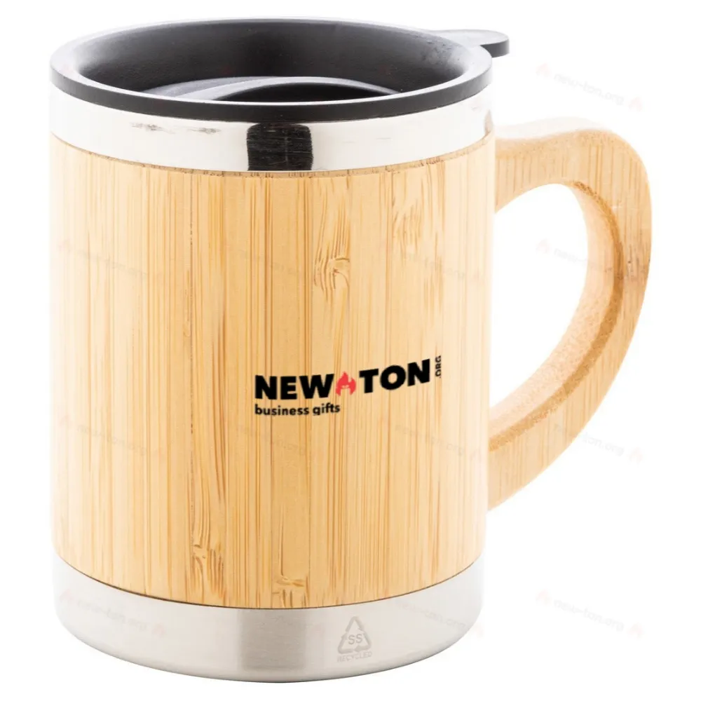 Термокружка из переработанной нержавеющей стали с двойными стенками, покрытая бамбуком, с бамбуковой ручкой и крышкой для питья из ПП, объемом 300 мл.